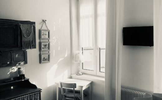 Cette chambre se trouve au premier étage de la maison ,côté façade et comprend un lit double 140/200 cm. Séparé par un muret il y a l’espace salle d’eau avec une douche ,les toilettes et un lavabo (open space).